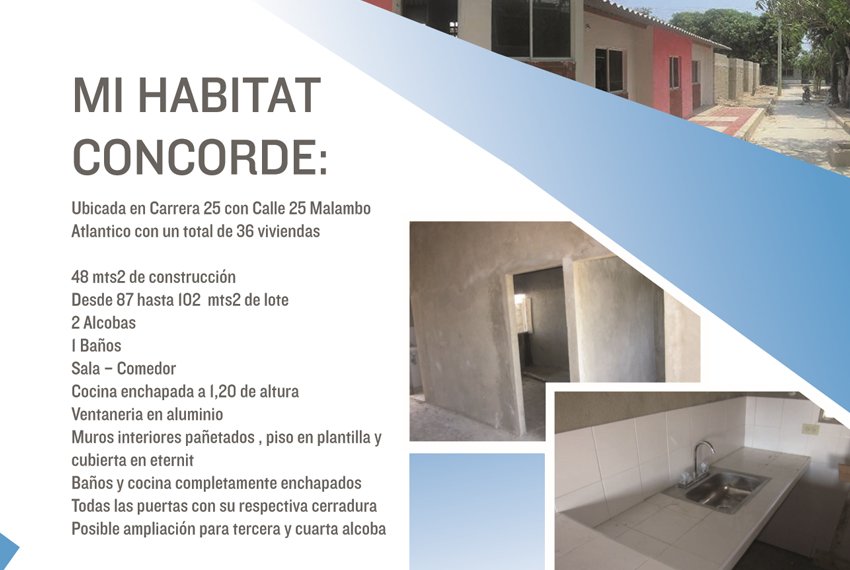 MI HABITAT CONCORDE CASAS es un Hermoso proyecto desarrollado de 268 viviendas, de 2 y 3 Alcobas, 1 Baño, Sala, Comedor, Cocina, Zona de labores, Patio.